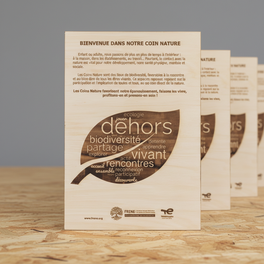 Nos autres réalisations Outil pédagogique – Panneau d’accueil « Bienvenue dans notre Coin Nature » Le projet Conception et réalisation d’un panneau pédagogique et visuel pour sensibiliser les publics (enfants, adultes, scolaires, etc.) à l’importance des Coins Nature comme espaces de biodiversité, de reconnexion à l’environnement et de bien-être. Ce support a pour vocation d’être installé à l’entrée des espaces naturels aménagés par le Réseau École et Nature (FRENE) et ses partenaires. Objectifs Sensibiliser à l’importance du contact avec la nature pour la santé et le développement personnel. Expliquer le concept de Coin Nature et ses bénéfices (biodiversité, épanouissement, apprentissage). Encourager la participation active des publics (enfants, familles, écoles, entreprises) à la création et à l’entretien de ces espaces. Fournir un support visuel attractif et pédagogique pour les structures membres du réseau FRENE. Réponse de l’atelier Création graphique : Conception d’une identité visuelle claire et engageante, mettant en avant les valeurs de biodiversité, de partage et de reconnexion à la nature. Pédagogie : Rédaction de textes accessibles et percutants, illustrant les bienfaits des Coins Nature et les actions possibles pour s’y impliquer. Design interactif : Intégration d’éléments visuels (mots-clés, illustrations) pour faciliter la compréhension et l’appropriation du message par tous les publics. Adaptation au terrain : Proposition d’un format résistant aux intempéries et facilement installable dans divers contextes (écoles, parcs, entreprises, etc.). Livrables Panneau gravé au laser sur CP MARIN + vernis extérieur (format A3+) Client : Réseau École et Nature (FRENE) L’expertise La Pompe Pédagogie environnementale : Capacité à traduire des concepts complexes en messages simples et engageants. Design graphique : Création d’outils visuels percutants, adaptés aux publics variés (enfants, adultes, scolaires). Approche collaborative : Travail en partenariat avec les acteurs de terrain pour répondre aux besoins concrets des structures d’éducation à l’environnement. Durabilité : Conception de supports résistants et adaptés aux usages extérieurs, en phase avec les valeurs écologiques du projet. https://atelier-lapompe.com/wp-content/uploads/2026/02/Creation-de-panneaux-de-signaletique-en-peuplier-realises-avec-soin-par-lAtelier-du-Tiers-lieu.mp4 Nos autres réalisations