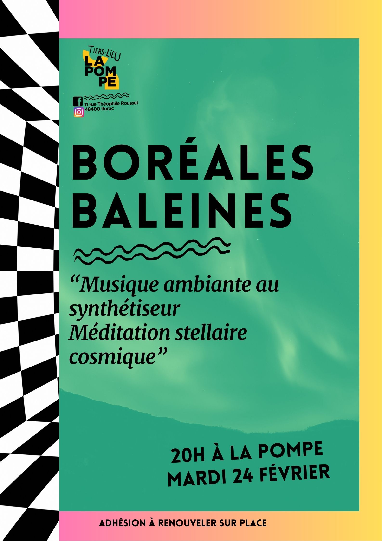 Accueil AGENDA Concert Boréales Baleines Boréales Baleines“Musique ambiante au synthétiseur Méditation stellaire cosmique” + Ajouter à mon Agenda Google + iCal / Outlook export Date24 Fév 2026Expiré! Heure 20h00 - 22h00 Lieu La Pompe11 Rue Théophile Roussel 48400 FLORAC Téléphone 0466451393 Catégorie ConcertProchain événement Repair Cafe DateMai 06 2026 Heure 17h00 - 20h00 Partagez cet événement