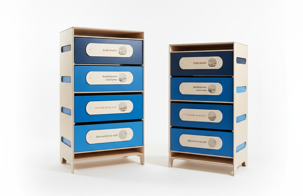 Le design privilégie la modularité, la lisibilité et la facilité de transport, tout en mettant en valeur le savoir-faire local.